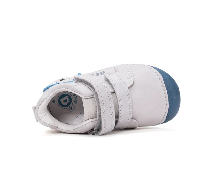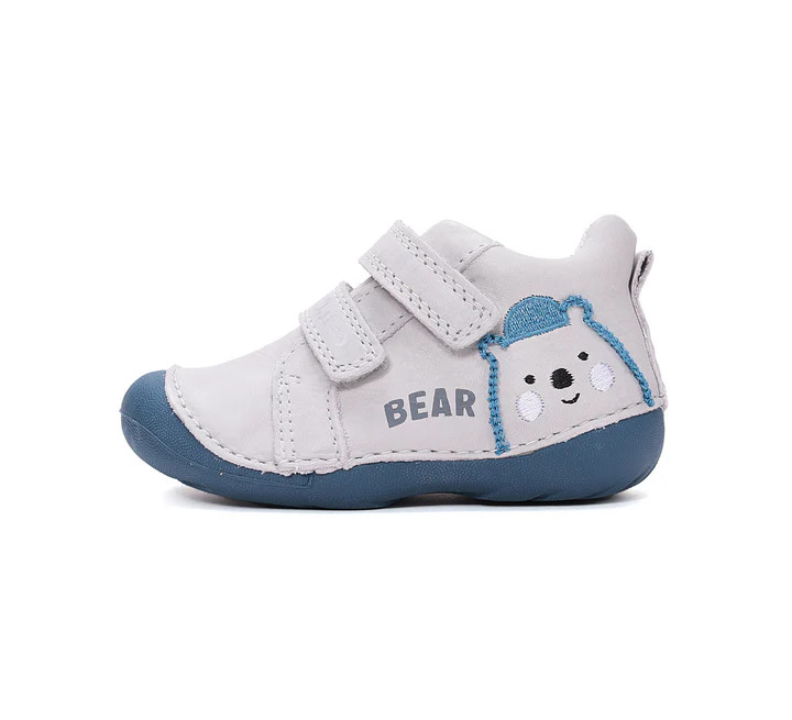 Ez a világosszürke, sötétkék talppal kombinált D.D.Step félcipő ideális választás a járni tanuló kisfiúknak. Az oldalán található kedves, sapkás maci figura és a "BEAR" felirat mosolyt csal az arcokra, miközben a cipő kialakítása maximálisan támogatja a bizonytalan első lépéseket.
